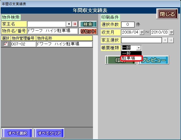 帳票種類の初期値は、[月次報告書]ボタン左横の種類「A3」「A4」「B4」「駐車場」の選択により判断されますが、 帳票種類「駐車場」の選択を確認します。