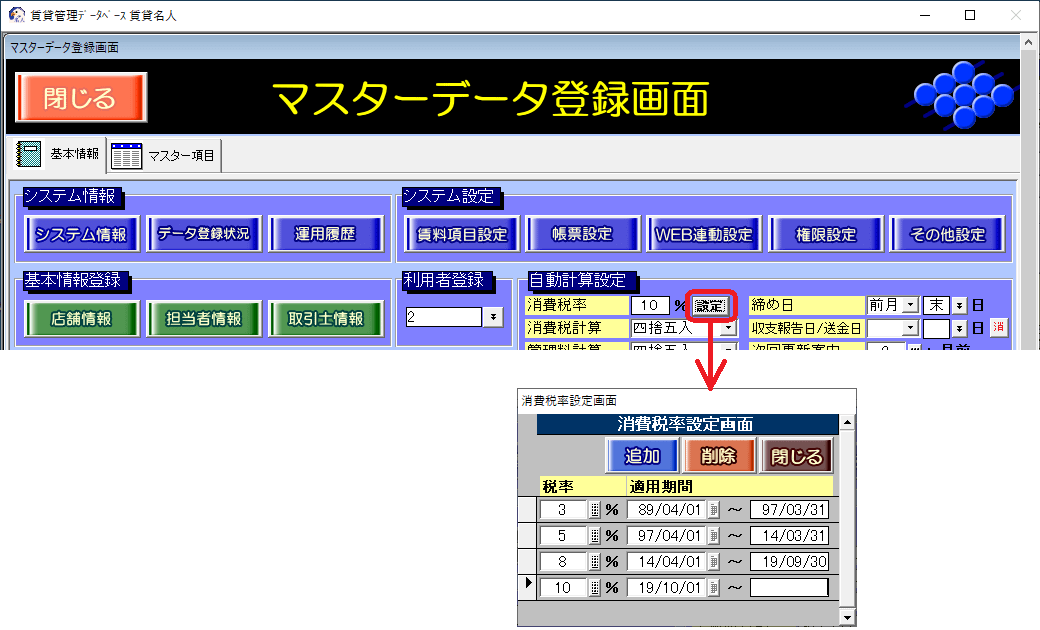 消費税率は、マスター管理画面の[基本情報]タブの「自動計算設定」欄の数値を参照します。