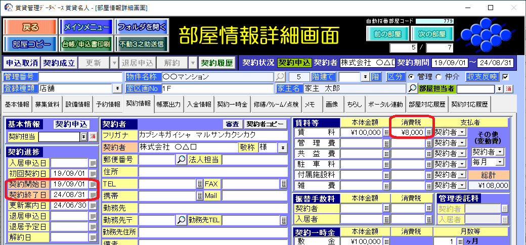 [契約情報]タブの賃料等欄の「本体金額」に、各入金レコードの「年月分」が該当する適用期間の税率で消費税計算をし、入金レコードを作成します。振替手数料は、「入金予定日」が該当する提供機関の税率で消費税計算をします。