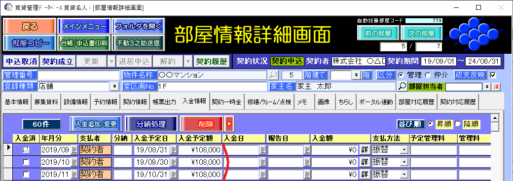 [契約情報]タブの賃料等欄の「本体金額」「消費税」を、そのまま入金レコードを作成します。