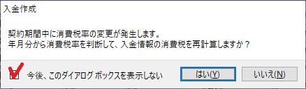次回以降の入金レコード作成時、税率相違の確認ダイアログは表示がされません。また、入金作成ウインドウで選択した「はい」「いいえ」が、その後の動作として引き継がれます。