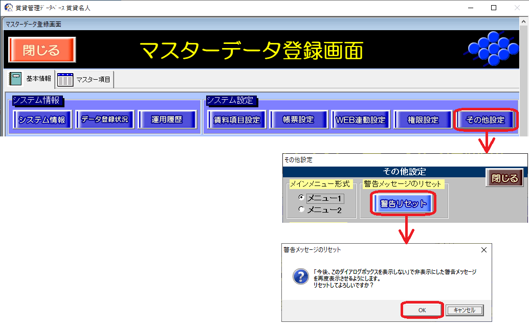 マスター管理画面の[基本情報]タブの[その他の設定]ボタン内[警告リセット]ボタンを実行します。以下のメッセージが出たら、[OK]ボタンで画面を閉じます。