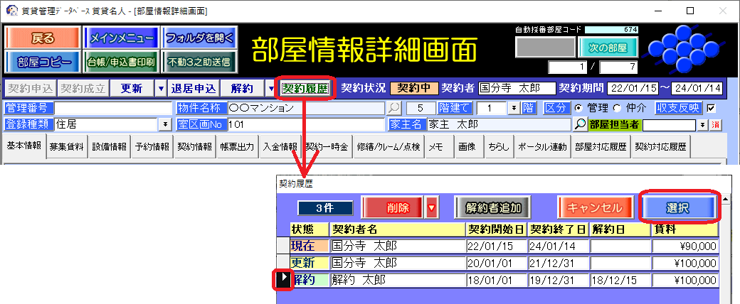 (1)部屋情報詳細画面の[契約履歴]ボタンをクリックし、解約者を選択します。