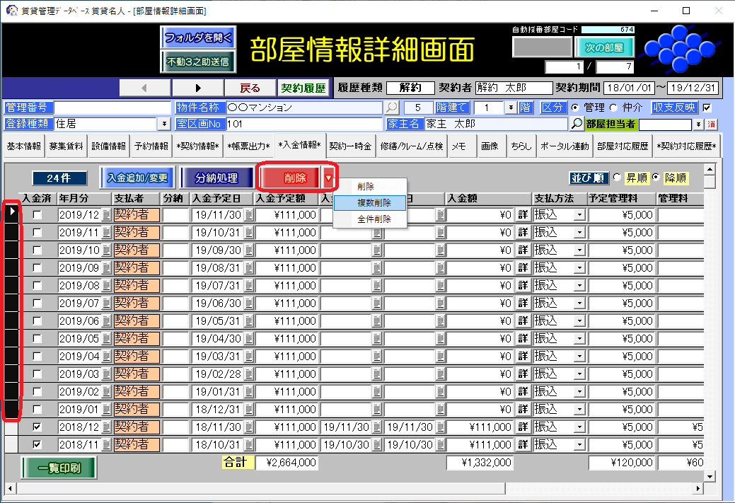 (2)[*入金情報*]タブをクリックし、解約月以降の入金レコードを削除(複数削除)します。