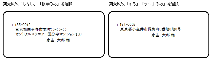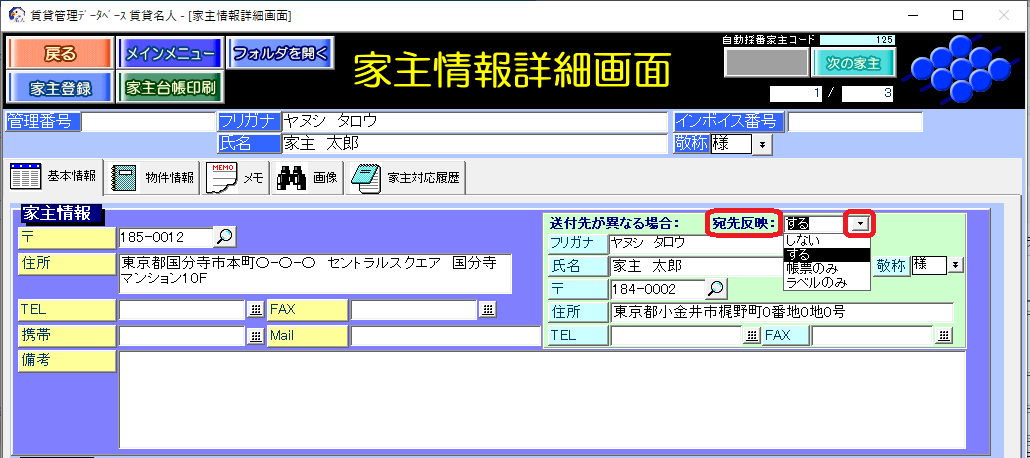 回答・対処方法 家主情報詳細画面の[基本情報]タブの「送付先が異なる場合」欄に、宛先反映を指定する箇所があります。 宛先反映「する」「ラベルのみ」を選択した場合は、枠内(緑色)に入力した情報で宛名が印字されます。 宛先反映の初期値は「しない」が選択され、枠内(緑色)はブランク(空欄)です。
