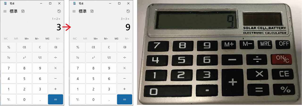 「 1 + 2 」で「3」となり、「 3 × 3 」を計算して「9」と計算されます。