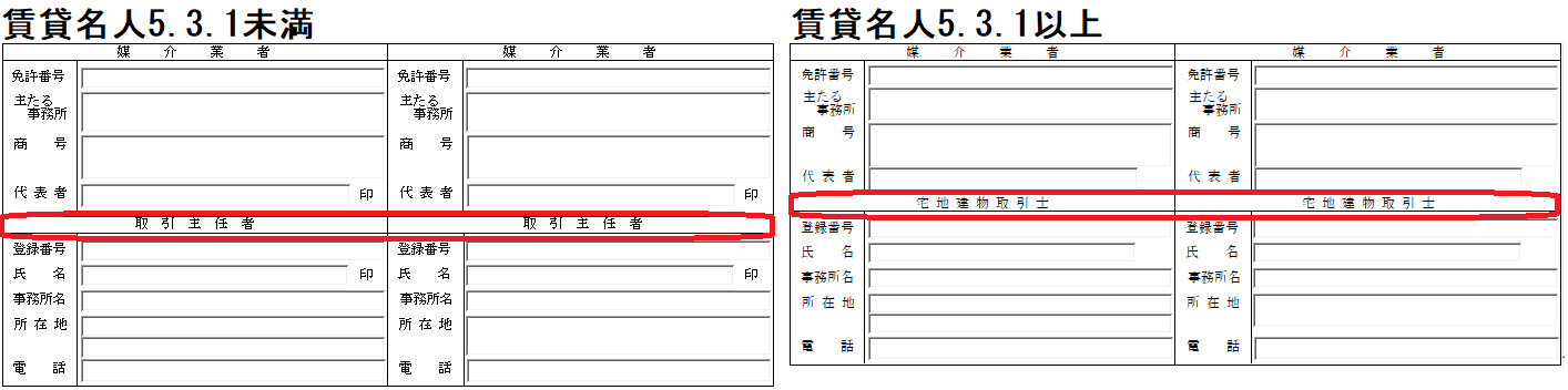 宅地建物取引業法の改正(平成27年4月1日)により、賃貸借契約書、重要事項説明書の「宅地建物取引主任者」欄のタイトル部分は、表記を変更できるよう雛型化しました。