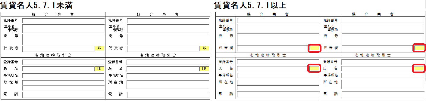 宅地建物取引業法の改正(令和4年5月18日施行)により、電磁的方法による契約書面の提供が可能となったため、標準帳票の「媒介業者」「宅地建物取引士」欄は、押印欄「印」の文字を削除しました。