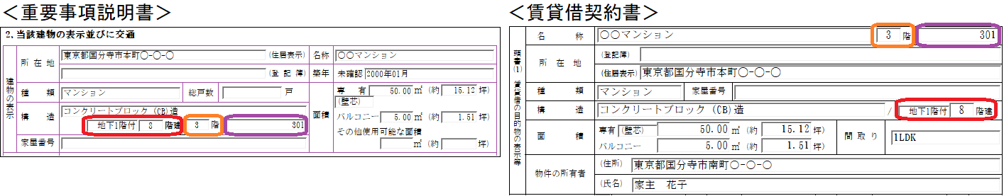 回答・対処方法 重要事項説明書、賃貸借契約書の「構造」欄に、建物全体の階層(地下○階付/〇階建て)、所在階(○階)、室区画№(号室)を記載します。