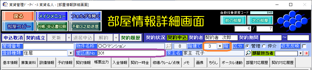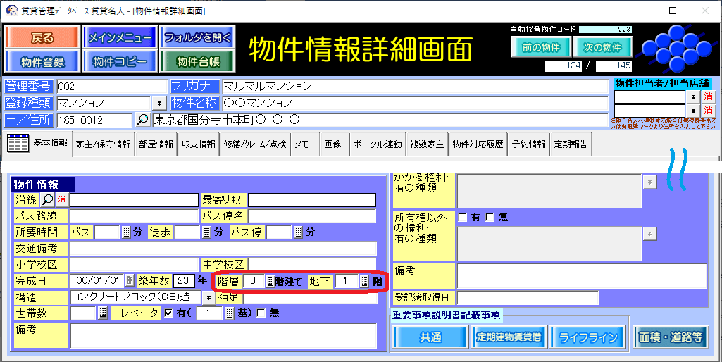 <操作方法> ①物件情報詳細画面の[基本情報]タブの「物件情報」欄で、「階層」「地下」を入力します。 ②部屋情報詳細画面の「室区画№(号室)」「所在階」を入力します。
