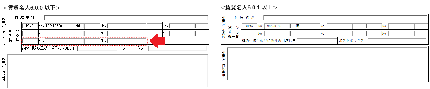 回答・対処方法 賃貸借契約書(事業用)の「貸主・甲」欄に、家主の「インボイス番号」を印字するようレイアウトを変更した際、ページ内に収める情報を極力変更しないで済むよう、頭書(3)「その他」の「貸与する鍵一覧」欄の後ろ 2項目(7~8)が、帳票印刷の対象から外れました。