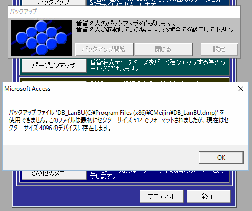 ②「バックアップファイル’DB_LANBU(C:\Program Files (x86)\Cmeijin\DB_LanBU.dmp)’を使用できません。このファイルは最初にセクターサイズ512でフォーマットされましたが、現在はセクターサイズ4096のデバイスに存在します。」