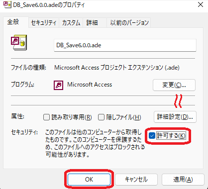 (4)設置した「DB_Save6.0.0.ade」が、セキュリティでブロックされていないか確認します。