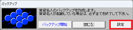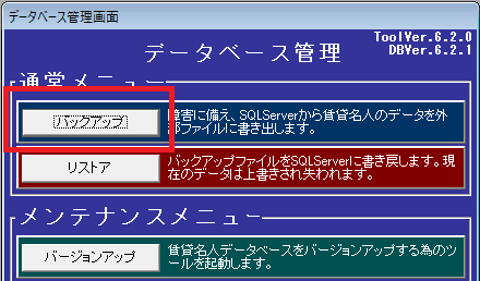 (1)賃貸名人データベース管理を起動し、[バックアップ]ボタンを実行します。