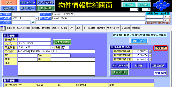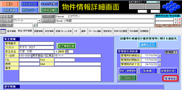 ①物件情報詳細画面の[家主/保守情報]タブで「管理契約」ボタンを押します。