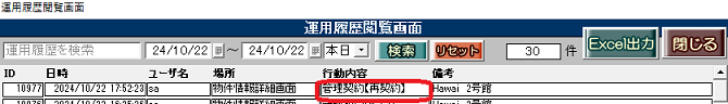 行動内容「管理契約【再契約】」備考「物件名称」と記録が残ります。