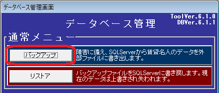 1.賃貸名人データベース管理を起動し、[バックアップ]ボタンを実行します。