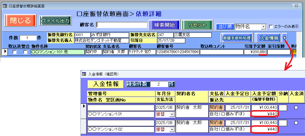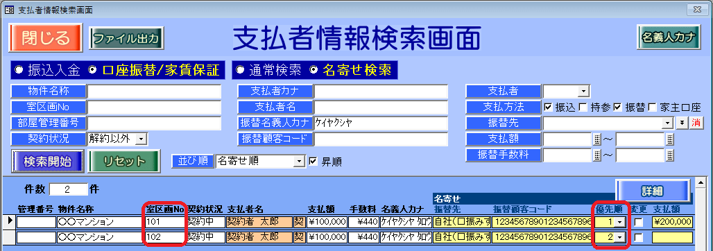 振替手数料は、支払者検索画面の名寄せ検索で優先順が一番高い部屋の金額を用います。