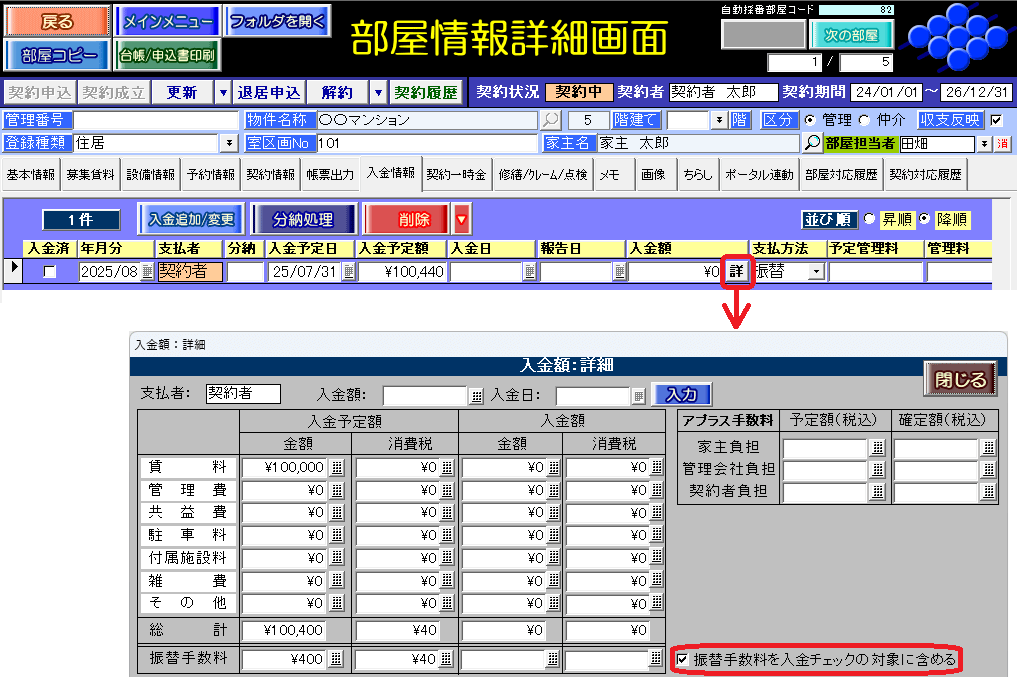 ※対象画面:部屋情報詳細画面の[入金情報]タブ、入金情報管理画面
