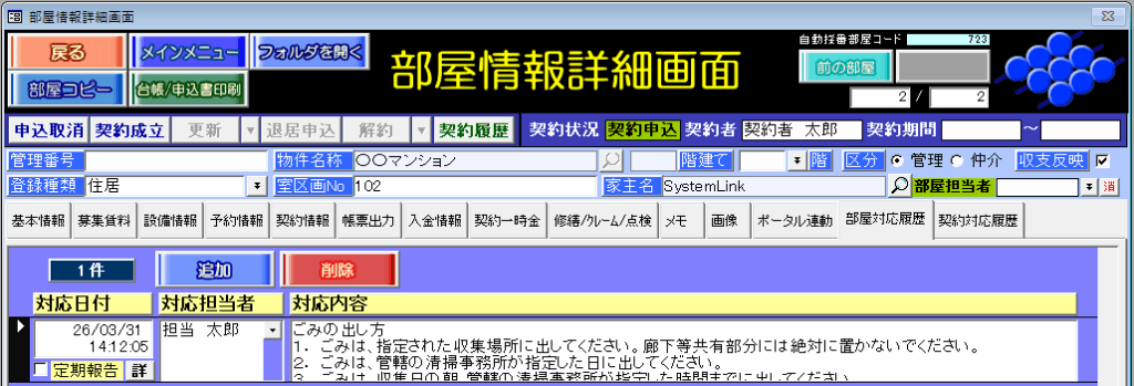 例:部屋情報詳細画面の[部屋対応履歴]タブのレコードセレクタからデータをコピー