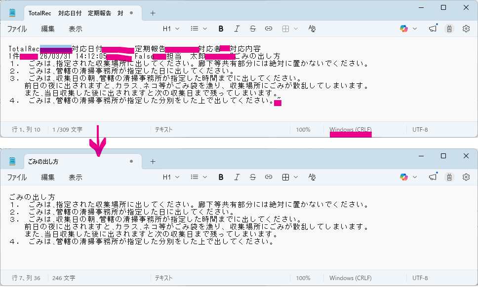 メモ帳に貼り付けると、データがタブ区切りになっており、文字情報が「""」で囲まれていることが確認できます。このデータを整理してください。