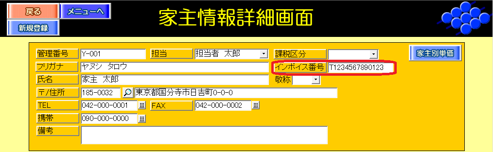 メインメニュー「物件情報」から家主情報詳細画面に移動し、「インボイス番号」を入力します。
