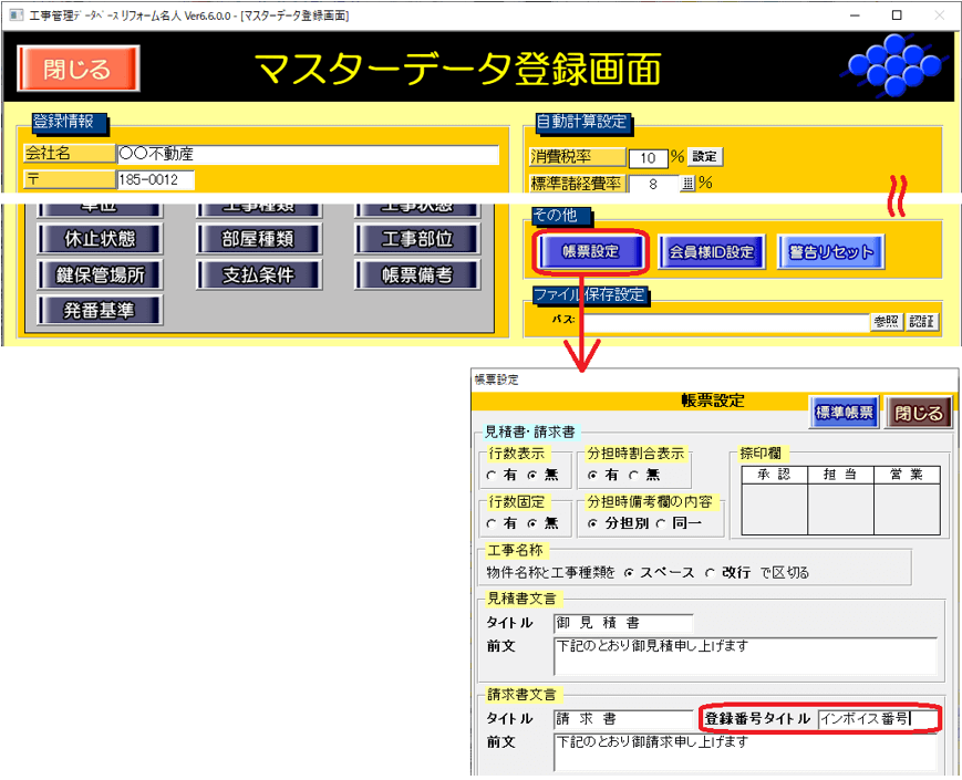 回答・対処方法 請求書の標準帳票のタイトル「登録番号」は、任意の表現に変更することができます。マスターデータ登録画面の「その他」欄の[帳票設定]ボタン内(帳票設定)で、「登録番号タイトル」欄を変更します。
