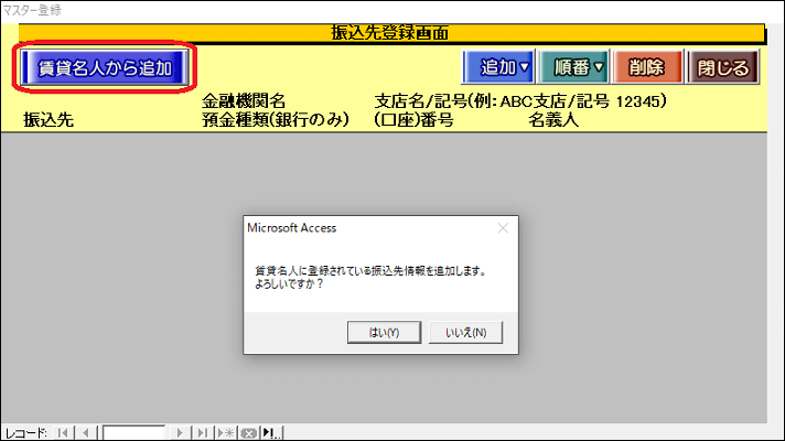 (1)[賃貸名人から追加]ボタンをクリックし、以下のメッセージを[はい]を選択します。