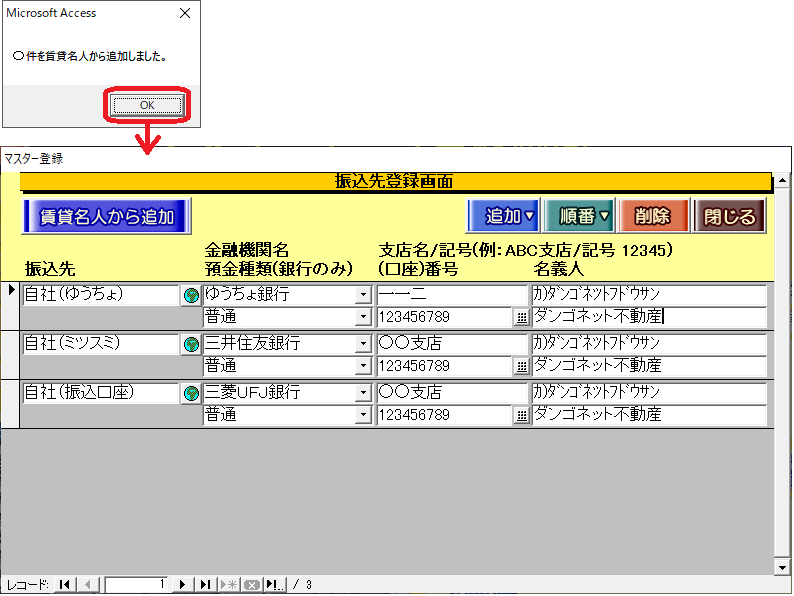 「賃貸名人に登録されている振込先情報を追加します。よろしいですか?」