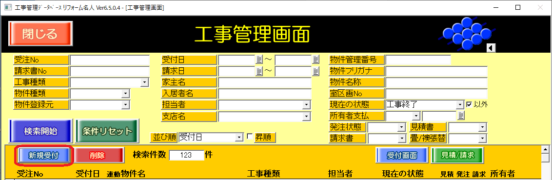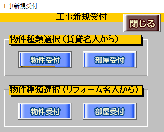 工事管理画面の[新規受付]ボタンで、登録する工事の物件種類を選択します。