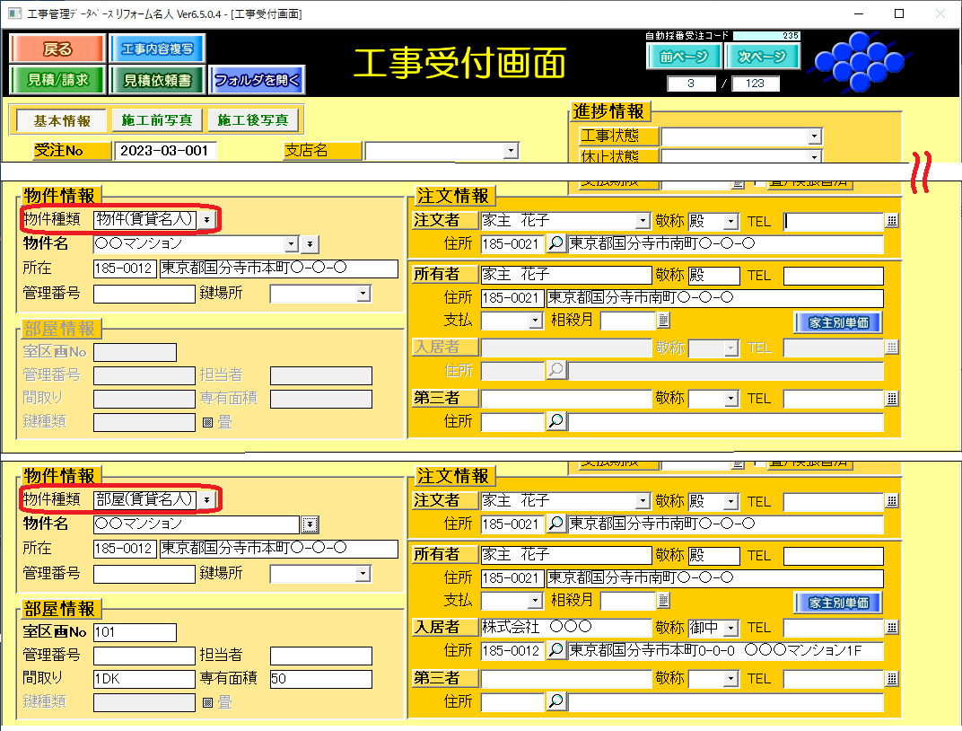 選択した種類は、工事受付画面の物件情報欄の「物件種類」で種類が確認ができます。