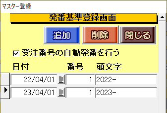 マスターデータ登録画面の[発番基準]ボタン内で、「受注No.」および「工事No.」の発番方法を設定します。