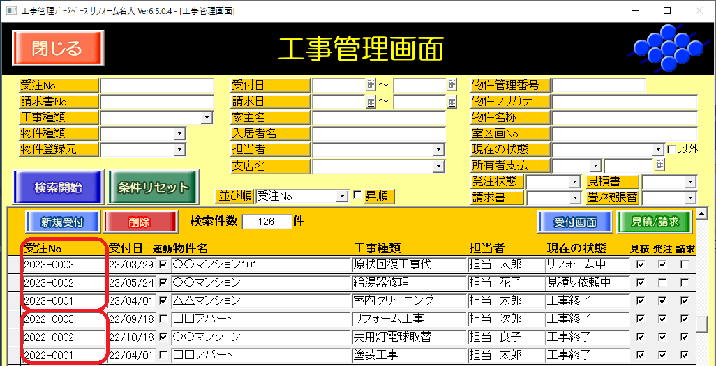 設定を行うと、工事案件の登録時に「受注No.」と「工事No.」を自動発番させることができます。
