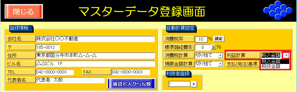 回答・対処方法 マスターデータ登録画面の自動計算設定のプルダウン「利益計算」は、見積/請求画面の「利益額」の算出時に消費税の取り扱いを制御する機能です。
