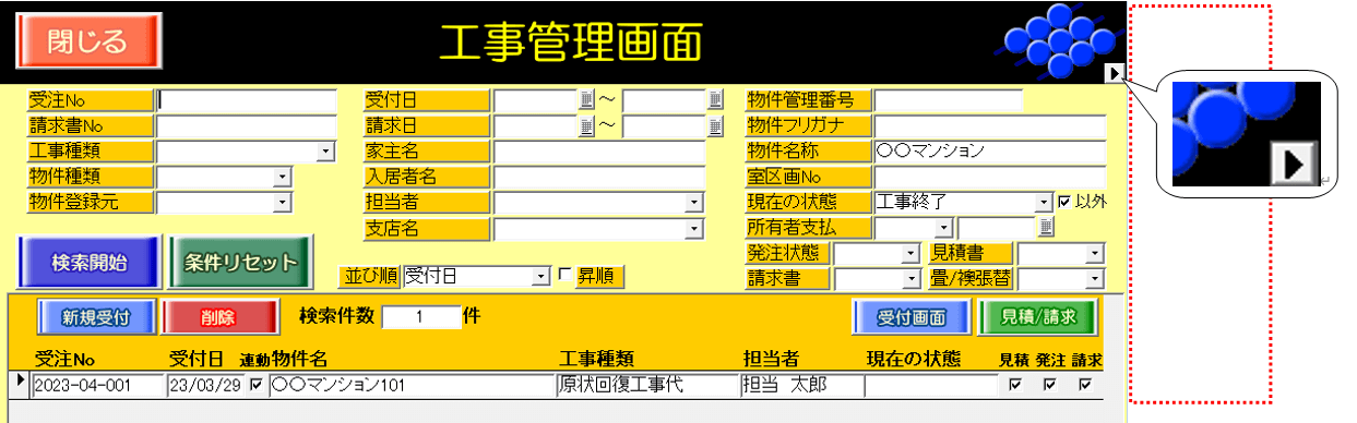 ・工事管理>工事管理画面 ・工程管理>工程管理画面 ・収益一覧>収益一覧画面