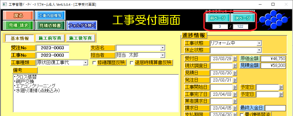 回答・対処方法 画面上部(右上)の[前ページ]・[次ページ]ボタンで、画面のページ送りができます。 複数の工事にわたる画面遷移ができますので、内容確認にご利用ください。