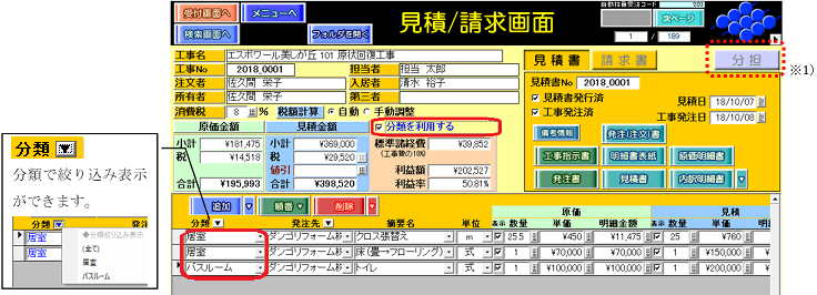 (1)見積・請求画面の[分類を利用する]チェックを付けます。[分類を利用する]チェックボックスは、工事単位で動作します。
