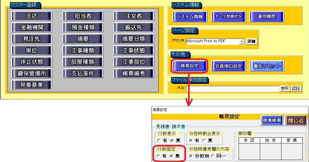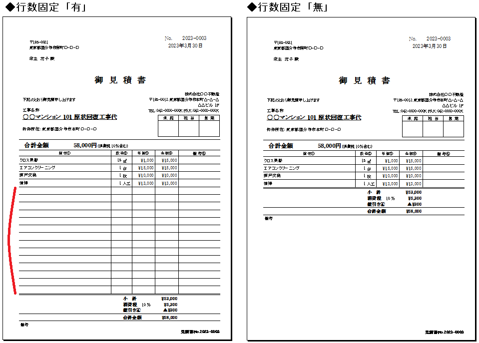 (2)「見積書・請求書」欄の「行数固定」欄で、「有」「無」を選択します。 ・「有」 :帳票に空行を表示します。 ・「無」(初期値):帳票に空行を表示しません。