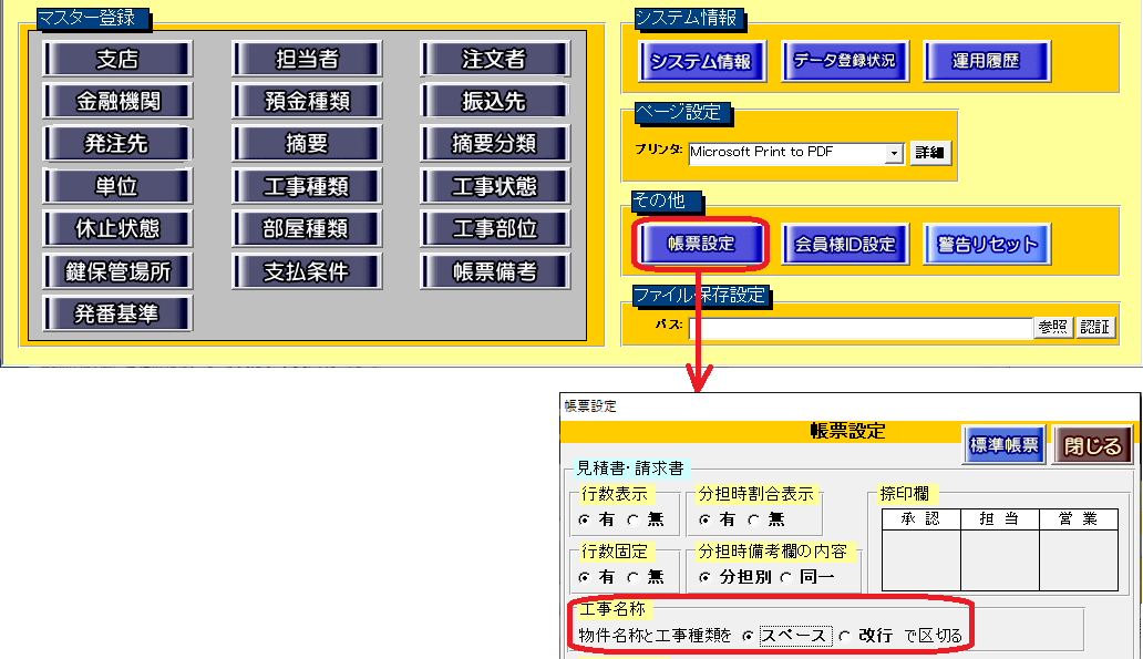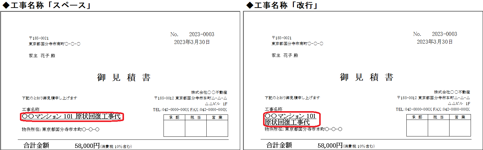 帳票「見積書・分担見積書」「請求書・分担請求書」の「工事名称」欄は、「物件名+室区画№」と「工事種類」を1つの枠内で一緒に続けて表示させるか、改行して分けて表示させるかをマスター管理画面の[帳票設定]ボタンで指定します。