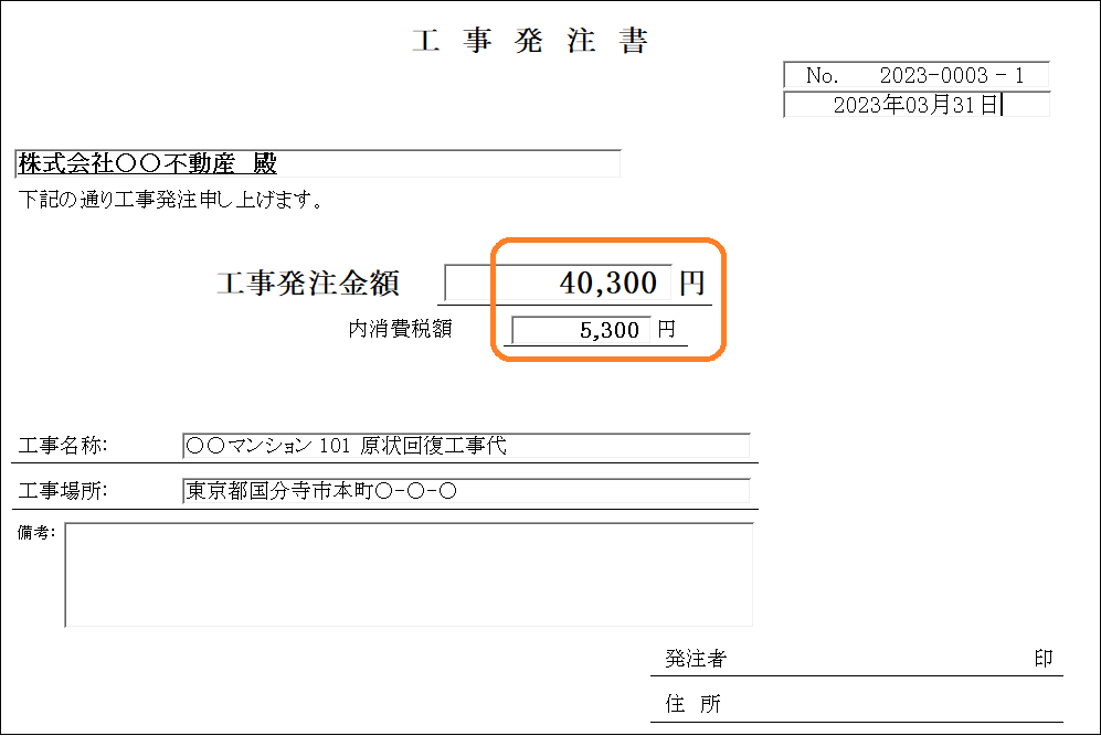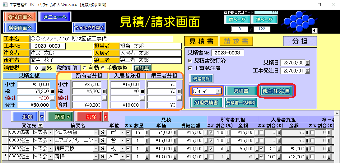回答・対処方法 帳票「工事発注書」は、分担毎(所有者、入居者、第三者)に分担金額で作成することができます。