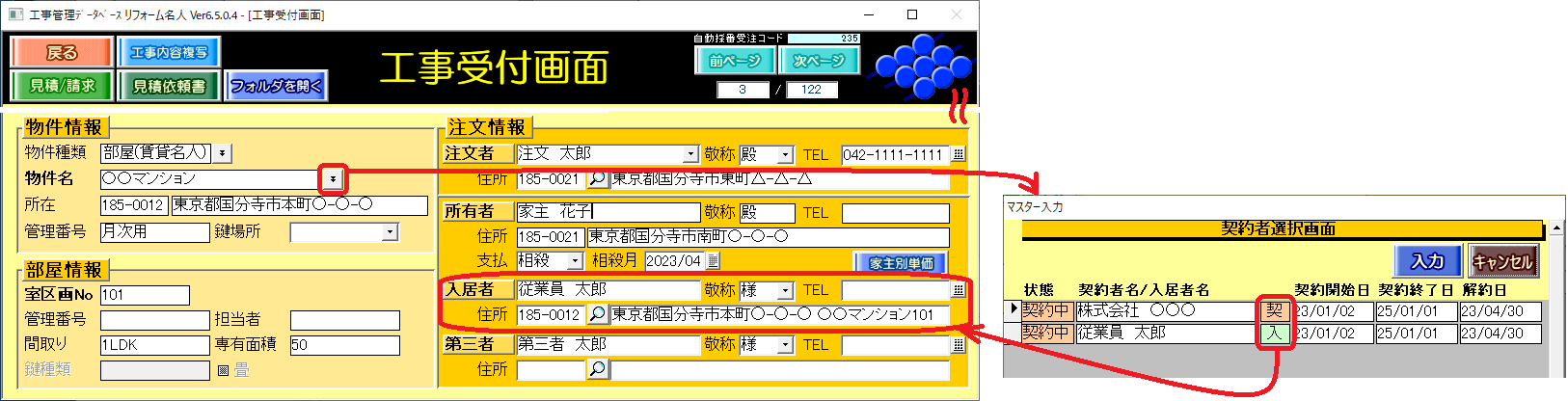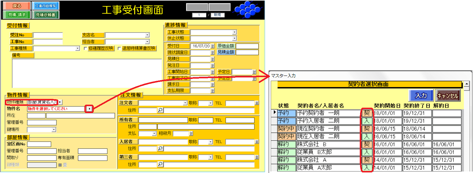工事受付画面の物件選択では、部屋受付で登録した工事「物件種類:部屋(賃貸名人)」「部屋:リフォーム名人)」は、契約者の選択ができます。契約者選択画面では、法人契約で契約者と入居者が相違するケースを考慮し、支払者「契約者」「入居者」を選択することができます。