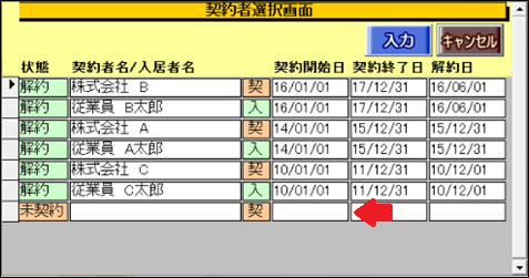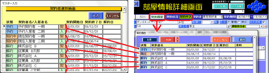 リフォーム名人の「状態」欄は、「予約」「契約中」「解約」「未契約」の4種類を表示します。賃貸名人連動版をご利用の場合、部屋情報詳細画面の契約履歴を参照します。賃貸名人の契約状況「契約申込」「契約中」「退居申込」をひとまとめにしてリフォーム名人では状態「契約中」と表示します。
