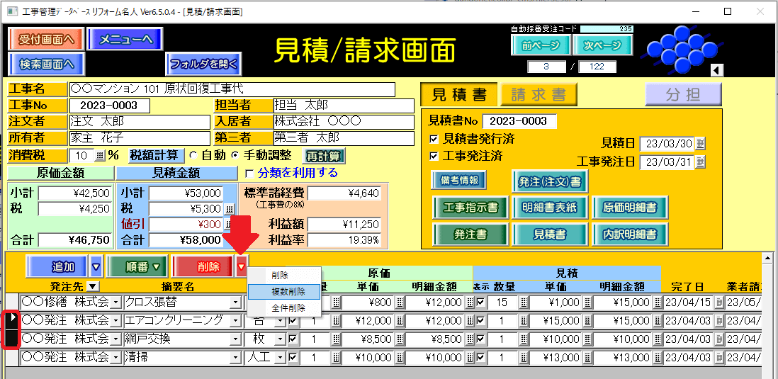 レコードセレクタで選択後、削除機能オプション[▼]ボタンの[複数削除]を利用します。