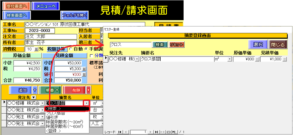 摘要レコードの「発注先」「摘要名」欄は、コンボボックスの最上部に選択肢「<検索...>」を表示させ、データ選択のスピードを上げることにお役立ていただけます。