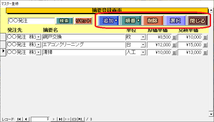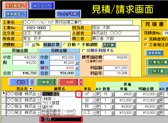 見積/請求画面 「発注先」「摘要名」「単位」「種類」「部位」「振込先」
