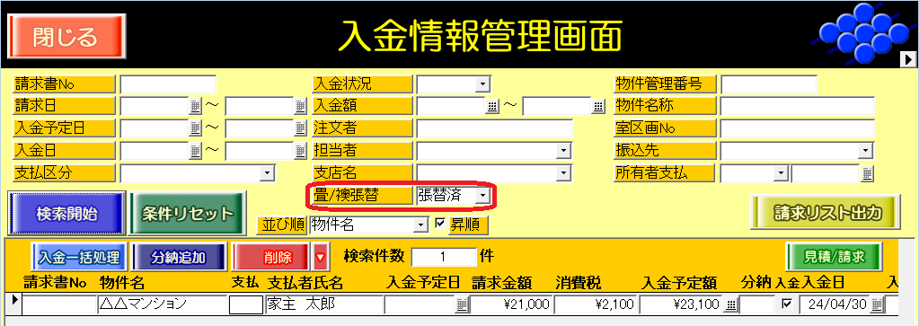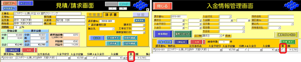 ・見積/請求画面、入金情報管理画面の[畳]チェックボックス