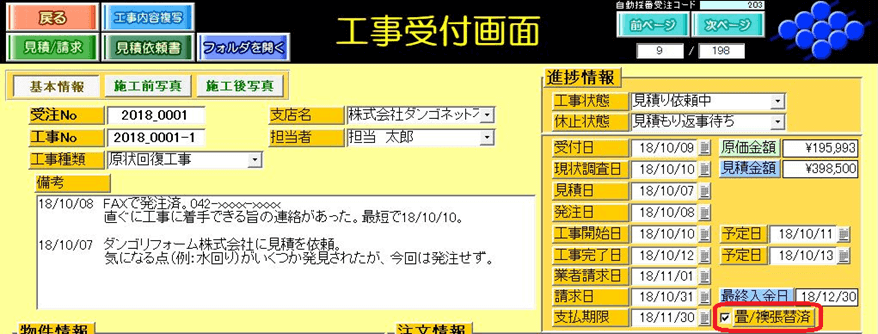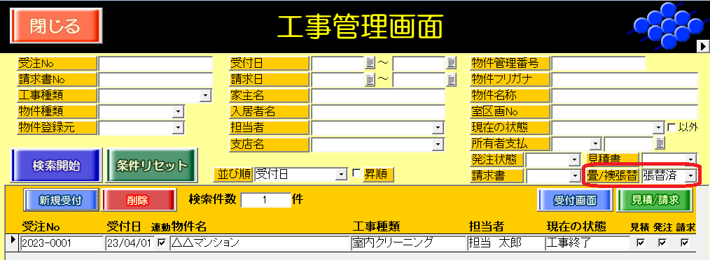 ・工事受付画面の[畳/襖張替済]チェックボックス