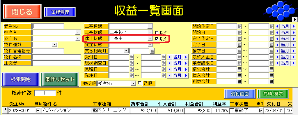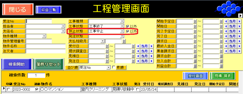 回答・対処方法 見積もりを出したが受注に至らなかったケースを考慮し、各画面は休止状態「工事中止」を除外検索して表示しています。休止状態「工事中止」が選択され、[以外]チェックボックスのチェックが付いた状態が初期値です。