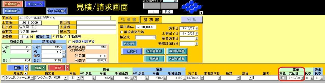 回答・対処方法 ・見積/請求画面 摘要レコードの「原価」欄は、発注業者に支払った日を記録することができます。 都度支払いをした場合、[支払]チェックを付け、「支払日」欄に日付入力します。