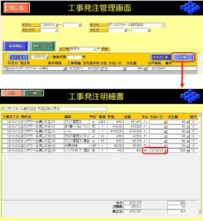 ・工事発注管理画面 「工事発注明細書」は、発注業者へ支払済の状態で集計されます。